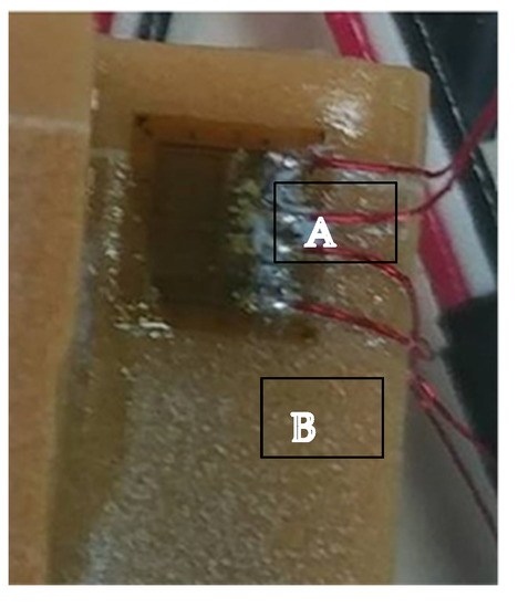 The strain gauges (A) connected directly to the sawbone (B) surface in the cervical part of the implant.