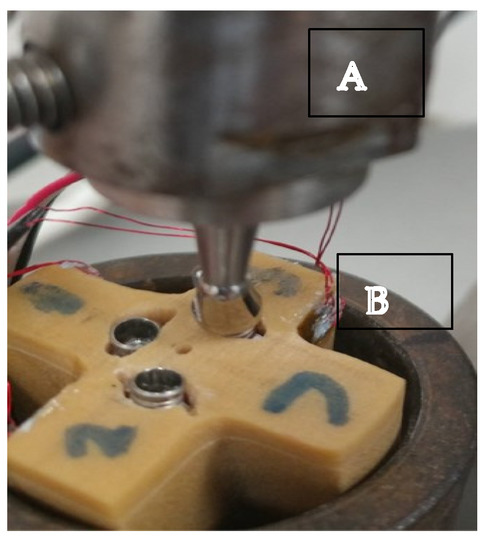The insertion loading machine (A) creates non-axial pressure on the abutment (B) connected to the implant.