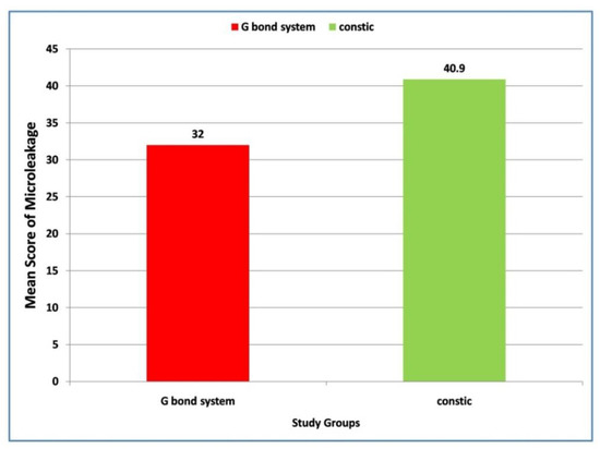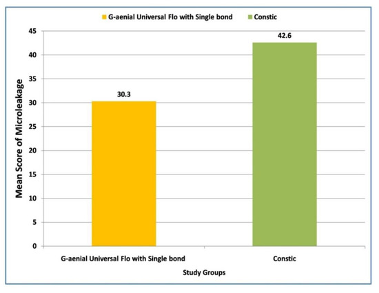 Comparison of mean values of microleakage in class V cavities with G-Bond system and Constic using G-aenial Universal Flo.