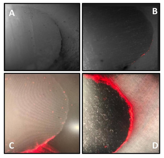(A–D) Images of confocal laser microscopy showing scoring criteria with (A) Score 0; (B) Score 1; (C) Score 2; (D) Score 3.