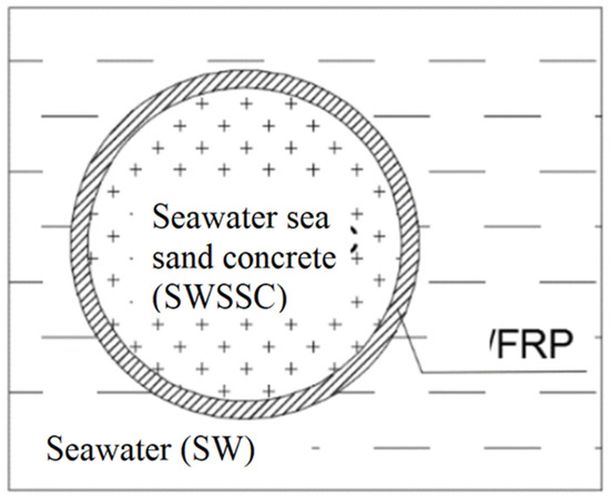 Earlier studies on FRPs in aggressive environments focused on the durability of FRP reinforcing bars or laminates, whereas there is a paucity of studies on the durability of FRPs used in concrete-filled tubes (CFT) and concrete-filled double-skin tubes (CFDT). A CFT is a hybrid system that consists of an encasing tube and a core concrete (Figure 1a [6]). It can be used as piles or bridge piers in marine structures due to a range of advantages, that include excellent load-carrying capacity, lateral concrete confinement, permanent formwork and good seismic performance [7,8,9,10]. A CFDT is a special type of CFT that consists of an inner tube and an outer tube with concrete sandwiched in between (Figure 1b [6]), which can reduce the self-weight of the member and achieve greater stiffness [8]. Seawater sea sand concrete (SWSSC)-filled FRP tubes achieve greater strength than plain concrete and hollow section tubes [6,11]. However, there is little reported on the durability of FRP tubes used in such applications in the marine environment. This could be a concern because of the dual exposure environment, i.e., SWSSC internally and seawater (SW) externally, which could be more damaging than a single exposure environment of concrete pore solution (Figure 2).