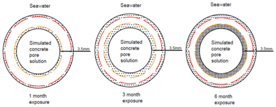 There is a need for a comprehensive investigation into the effect of a dual exposure environment of SWSSC internally, and SW externally (as seen in Figure 2) on the degradation of different types of confining FRP tubes, for the application of SWSSC-filled tubular/SWSSC-filled double-skin tubular structures in a marine environment. Exposure to such dual environment might lead to different degradation patterns, such as the one schematically shown in Figure 3, or a different degradation rate than those proposed for a single alkaline environment [15] or a single SWSSC environment [16] for internal FRP reinforcements. In the dual exposure environment (Figure 2), the internal surface of the tube is exposed to SWSSC, comprising a mix of alkali and chloride salts and the external exposure environment of seawater. Therefore, FRP constituents (i.e., fibre, resin, fibre–resin interface) adjacent to the internal surface might degrade to a severer extent (represented by the intensity of dots in Figure 3) and at a faster rate (represented by red/yellow dash lines for degradation fronts in Figure 3) in moving towards the mid-tube thickness than those adjacent to the external surface.