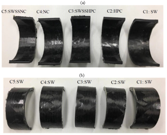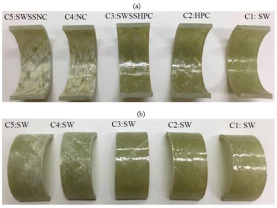 After the 6-month exposure to C4 (NC internally and SW externally) and C5 (SWSSNC internally and SW externally), the inner surface of BFRP (Figure 4) and GFRP (Figure 5) exposed to the higher alkalinity solutions (i.e., NC, SWSSNC) had turned brighter and rougher, whereas only slight surface changes were observed on the outer surface of the tubes. Tubular specimens exposed to C1 (SW internally as well as externally), C2 (HPC internally and SW externally) and C3 (SWSSHPC internally and SW externally) did not exhibit any distinguishable surface changes. Regarding CFRP tubular specimens, the lustre and colour of both exposure surfaces largely remained unchanged, irrespective of the solution combinations they were exposed to (Figure 6).