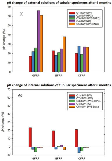 For pH increases of both the internal and external seawater solution in C1 for all FRPs, the most likely reason is the leaching of FRP component(s) during exposure in this specific environment. In other cases, particularly NC (C4) and SWSSNC (C5) internally for GFRP and BFRP, the considerably greater pH increase in the external solutions can be attributed to a greater leaching of alkalis from glass/basalt fibres and/or a diffusion of alkali ions from the internal alkaline solutions to the external solutions, which can be facilitated by an intensive chemical attack from the internal side of FRP tubes. Consistent with the visual observation (Section 3.1), the higher alkalinity solutions (i.e., NC, SWSSNC) tended to degrade glass/basalt fibres and the fibre–resin interface much more severely, which caused a greater transport of and uptake of moisture. This can also explain the relatively lower pH change of the external solution of CFRP, since carbon fibres and the fibre–matrix interface have been found to demonstrate good/durable degradation resistance in neutral pH solutions (SW) or higher alkalinity solutions (NC/SWSSNC) in the single environment exposure tests [3].