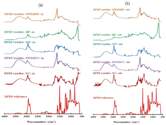 FTIR absorption spectra for the reference specimens and the (a) internal and (b) external solution residues after exposure of BFRP at 60 °C for 6 months.