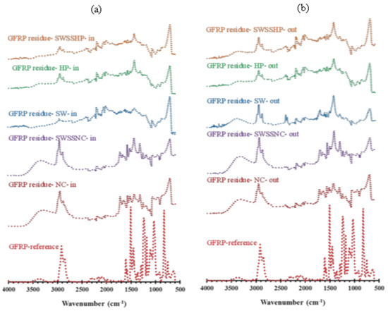Figure 8, Figure 9 and Figure 10 present the absorption spectra of unexposed BFRP, GFRP and CFRP composites and the solution residues collected after the exposure of these three types of FRPs to five different dual-exposure combinations (Table 2) for 6 months at 60 °C. The assignments of the characteristic absorption bands of unexposed FRPs are provided in Table 5.