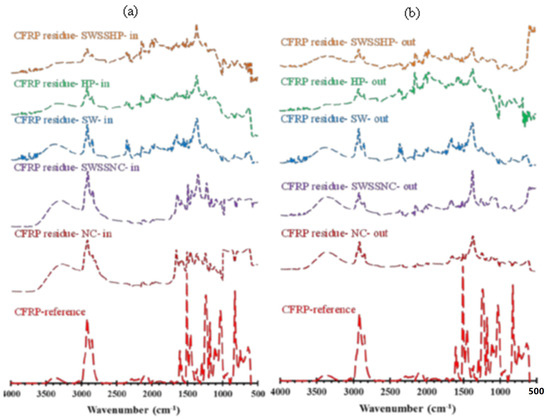 FTIR absorption spectrum for the reference specimens and the (a) internal and (b) external solution residues after exposure of CFRP at 60 °C for 6 months.