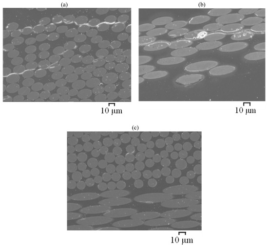 SEM images of the cross-sections of BFRP exposed for 6 months at 60 °C to C5 dual environment (Table 2): (a) adjacent to external surfaces; (b) adjacent to internal surface; (c) in the mid-width area (specimens prepared by grinding-and-polishing method).