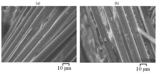 SEM images of the cross-sections of (a) BFRP and (b) GFRP (E-glass) exposed for 6 months at 60 °C to C1 environment (Table 2) (specimens prepared by liquid nitrogen fracturing method).