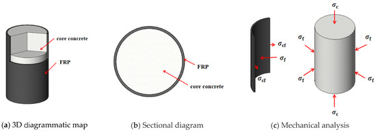 Fibre-reinforced polymers (FRPs) are widely used in composite structures and for structural strengthening owing to their light weight, high strength, and good corrosion resistance [1,2,3,4,5,6,7]. As shown in Figure 1, an FRP-confined circular concrete column consists of core concrete and an external confinement of wrapped FRP. is the axial compressive stress on the FRP-confined circular concrete column; is the lateral constraint stress on the core concrete of the FRP-confined circular concrete column; and is the reaction force generated by the core concrete under the FRP-confined action.