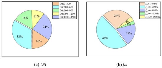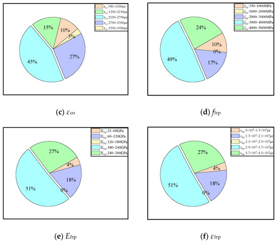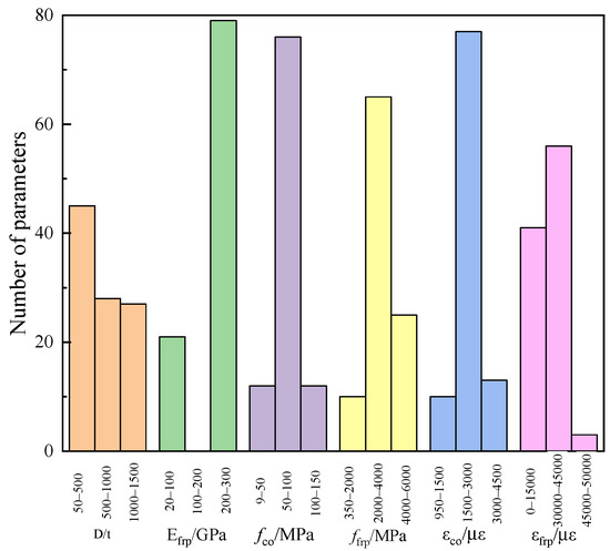 The range of the D/t, fco, εco, ffrp, Efrp, and εfrp are shown in Figure 2 and Figure 3. The D/t was mainly distributed in the range of 0–500. The minimum fco was 9.9 MPa, the highest was 136.3 MPa, and the data between 50 MPa and 100 MPa were the highest. The εco was concentrated in the range of 1500–3000 με. The ffrp in the range of 2000 MPa–4000 MPa was up to 65%. Most data on the Efrp were distributed in the range of 200–300 GPa. The data points of the εfrp in the range of 4.5 × 104–5 × 104 με were the least, and maximum data points were in the range of 3 × 104–4.5 × 104 με.