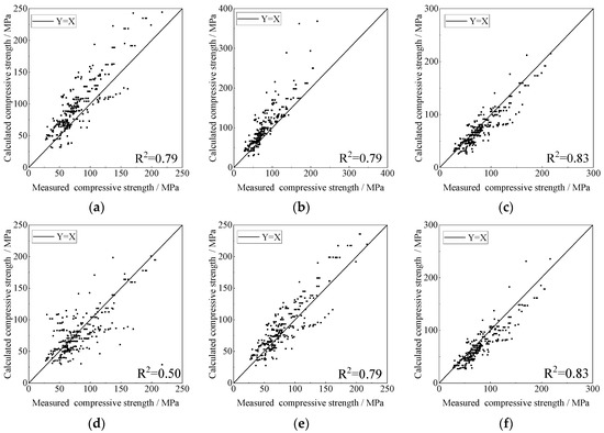 Predictive results of compressive strength. (a) Mander Model, (b) Fardis Model, (c) Lam Model, (d) Bisby Model, (e) Wu Model, (f) Youssef Model.