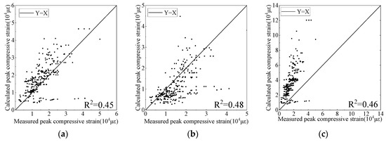 Table 4 summarises the evaluation indices (R2, MSE, MAPE, and IAE) of the predictive accuracy in the peak compressive strain of all the models. It can be observed from Table 4 that the predictive accuracy of the peak compressive strain is lower than that of the compressive strength for all the models. The regression coefficient of the Fardis model [17] with the highest predictive accuracy was only 0.48; it had a high dispersion and error.