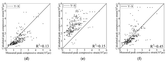 Predictive results of peak compressive strain. (a) Mander Model, (b) Fardis Model, (c) Lam Model, (d) Bisby Model, (e) Wu Model, (f) Youssef Model.