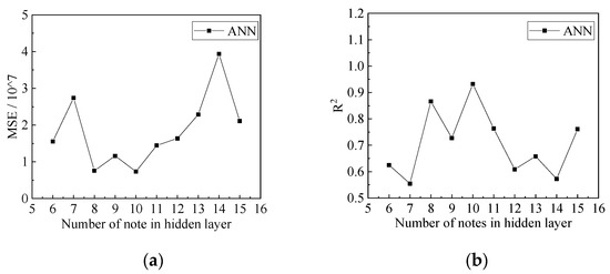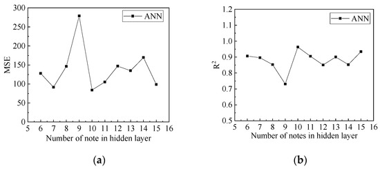 The number of nodes in the hidden layer plays a vital role in the predictive accuracy of an ANN. To determine this, the predictive accuracies of different numbers of nodes in the hidden layers were compared and analysed. The influence of the number of nodes in the hidden layers on the predictive accuracy of the compressive strength is shown in Figure 6, and the influence of the number of nodes in the hidden layers on the predictive accuracy of peak compressive strain is shown in Figure 7. It can be seen that when the number of nodes in the hidden layers is 10, the MSE of the compressive strength and peak compressive strain is the lowest, and R2 is the highest. The predictive accuracy of the ANN model was the highest. Therefore, when predicting the compressive strength and peak compressive strain, the number of nodes in the hidden layers in the ANN model was 10.