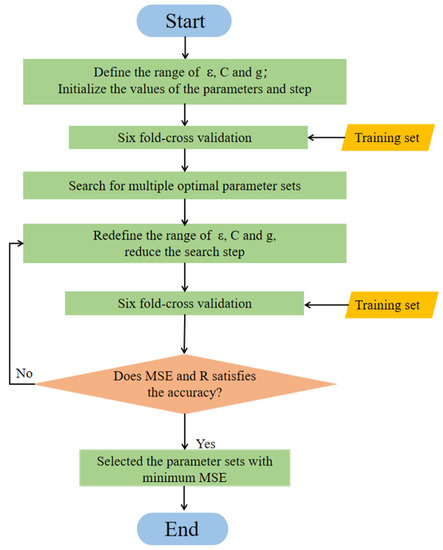 To determine the optimal values of ε, C, and g in the SVR, each value is tested in a certain space on the premise of specifying the step. Then, based on the flow of the SVR algorithm, the parameter values of the SVR with optimal accuracy are derived: ε = 0.01, C = 20, and g = 0.3. The flow of the SVR algorithm is illustrated in Figure 8.