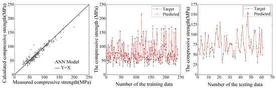A MATLAB-based program with a graphical user interface (GUI) was developed to train and evaluate the ANN model. The ANN model divided the established database into two parts: 80% for training (general is 70–90%) and 20% for testing (general is 10–30%). According to the predictive target, there are six and one nodes in the input and output layers, respectively; the momentum rate is 0.5; the learning cycle is 103; and the learning accuracy is 4 × 10−7.