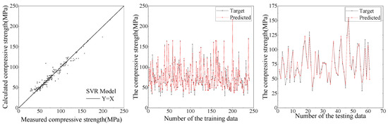 Support vector regression (SVR) is a regression model developed by Vapnik [44], who introduced insensitive loss functions into the support vector machine (SVM) based on statistical learning theory. It has better predictive ability. Ahmad used SVR, NMR (nuclear magnetic resonance), and an ANN to predict the splicing strength of reinforced concrete members based on the diameter of the rebar, the compressive strength of concrete, and the protective cover thickness. The results show that SVR has the highest forecasting accuracy [31]. Tran used SVR to predict the adhesion strength of the interface between FRP and concrete using the water–cement ratio, the recycled aggregate replacement rate, the sand rate, and other parameters. The results showed that SVR had good predictive performance [45].