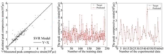 Based on the established database, the comparison between the ANN and SVR models for the predictive results of compressive strength and peak compressive strain are shown in Figure 9, Figure 10, Figure 11 and Figure 12, respectively. It can be seen from Figure 9, Figure 10, Figure 11 and Figure 12 that the ANN and SVR models can accurately predict the compressive strength and peak compressive strain of FRP-confined circular concrete columns, and the predictive accuracy is much higher than that of their existing axial compressive constitutive models.