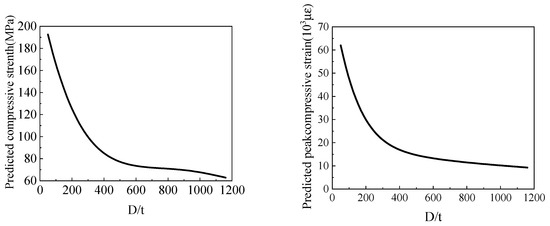 The influence of D/t on the compressive strength and peak compressive strain of the FRP-confined circular concrete columns is shown in Figure 13. It can be seen that both the compressive strength and the peak compressive strain of FRP-confined circular concrete columns decrease with an increase in the D/t of the specimen. When the D/t increased from 200 to 1000, the compressive strength decreased from 130 MPa to 60 MPa and the peak compressive strain decreased from 3 × 104 to 104. When the D/t increases and the section size of the core concrete remains unchanged, the fibre thickness decreases and the force of constraint it can provide decreases, thus reducing the bearing capacity and ductility of the specimens [73,74,75,76,77].