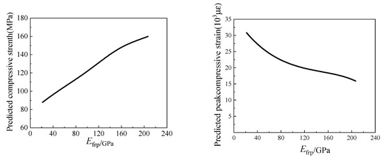 The influence of the Efrp on the compressive strength and peak compressive strain of the FRP-confined circular concrete columns is shown in Figure 14. It can be seen that the compressive strength of the FRP-confined circular concrete columns is positively correlated with the Efrp, whereas the peak compressive strain is negatively correlated with the Efrp. When the Efrp increases from 40 GPa to 200 GPa, the compressive strength increases from 90 MPa to 150 MPa, and the peak compressive strain decreases from 2.5 × 104 to 1.5 × 104. When the Efrp increases, the elastic deformation resistance, the brittleness of the specimens, and the bearing capacity of the specimens increase, and the ductility decreases [12,78,79].