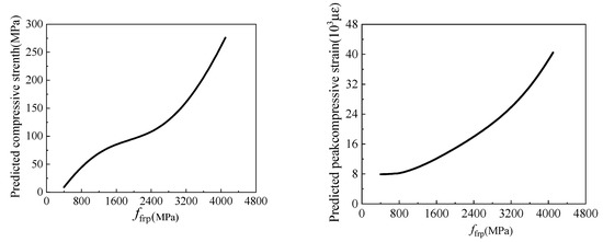 The influence of ffrp on the compressive strength and peak compressive strain of the FRP-confined circular concrete columns is shown in Figure 15. It can be observed that the compressive strength and the peak compressive strain of the FRP-confined circular concrete columns increase with an increase in ffrp. When ffrp increases from 800 MPa to 4000 MPa, the compressive strength increases from 50 MPa to 250 MPa, and the peak compressive strain increases from 8 × 103 to 4 × 104. When ffrp increases, the force of the constraint provided by the FRP increases, and the bearing capacity and the ductility of the specimens are improved [51,80,81].