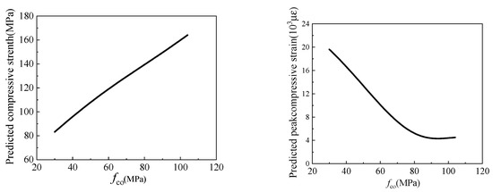 The influence of fco on the compressive strength and peak compressive strain of the FRP-confined circular concrete columns is shown in Figure 16. It can be seen that the compressive strength of the FRP-confined circular concrete columns is positively correlated with fco, while the peak compressive strain of the FRP-confined circular concrete columns is negatively correlated with fco. When fco increases from 40 MPa to 100 MPa, the compressive strength of the FRP-confined circular concrete columns increases from 90 MPa to 160 MPa, and their peak compressive strain drops from 1.6 × 104 to 4 × 103. When fco increased, the overall strength, brittleness, and the bearing capacity of the specimens increased, and the ductility decreased [82,83,84].