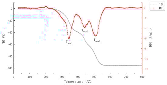 It can be seen from the figure that the weight loss of epoxy asphalt mainly occurs at 232.1–579.9 °C. Moreover, the weight loss rate is 96.13% and the maximum weight loss rate is −6.093 %/min. According to the weight loss rate curve, the pyrolysis weight loss process of epoxy asphalt can be divided into three consecutive stages. The temperature in the first stage ranges from 232.1 to 387.9 °C and the corresponding Tmax1 is observed at 342.8 °C, and the weight loss is approximately 38.1%. In this stage, the weight loss mainly occurs due to the fracture and degradation of the network structure of epoxy resin, the large amount of pyrolysis weight loss of saturated components, and participation of some small molecules of volatile aromatic components during pyrolysis. The saturated fraction and aromatic fraction are decomposed into alkanes and cycloalkanes under high-temperature conditions. With the further increase in temperature, the alkyl side chain breaks to generate some short-chain alkanes and gaseous products [28]. The temperature in the second stage ranges from 387.9 to 467.3 °C and the corresponding Tmax2 is observed at 440.8 °C, and the weight loss is approximately 23.8%. This stage mainly involves the decomposition of compounds and colloids formed in the previous stage. At higher temperatures, some relatively stable chemical structures begin to undergo cracking reaction and generate a large number of free radicals and a large number of gaseous products. Moreover, dehydrogenation polymerization of residual substances generates more stable macromolecular substances. The temperature in the third stage ranges from 467.3 to 579.9 °C and the corresponding Tmax3 is observed at 510.9 °C, and the weight loss is approximately 33.7%. This stage is mainly caused by the further degradation of semicoke polymer formed in the first stage of epoxy resin and the pyrolysis of heavy components in asphalt. In this stage, the carbonized layer generated by alkyl side-chain dehydrogenation polymerization in the first and second stages begins to crack and burn, and the heavy substance, asphaltene, in asphalt begins to burn [29].