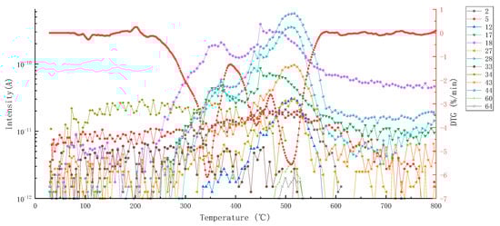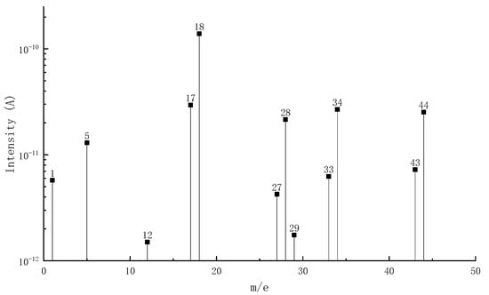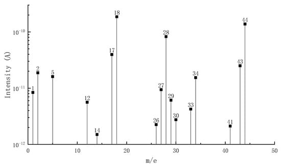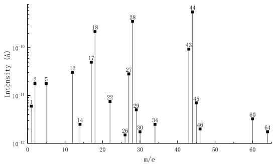 It can be seen from Figure 2 that the peak value of the ion flow curve appears when it is close to the peak temperature of each pyrolysis stage, indicating that the volatile release is the largest at this time. Figure 3, Figure 4 and Figure 5 show that the high-content ions in the gas volatiles at the peak temperature in the three stages of pyrolysis are the same, that is, H2O with a mass charge ratio of 18, N2, CO, and C2H4 with a mass charge ratio of 28, and CO2, C2H4O, N2O, and C3H8 with a mass charge ratio of 44. Compared with the second stage, the overall ion current intensity in the third stage is larger, and C3H8O, C2H4O2, C2H8N2, and C2H4S with a mass charge ratio of 60 and SO2 with a mass charge ratio of 64 are also produced.