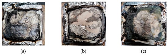 Images of residue after the cone calorimeter test using different materials: (a) Base asphalt, (b) epoxy resin, and(c) epoxy asphalt.