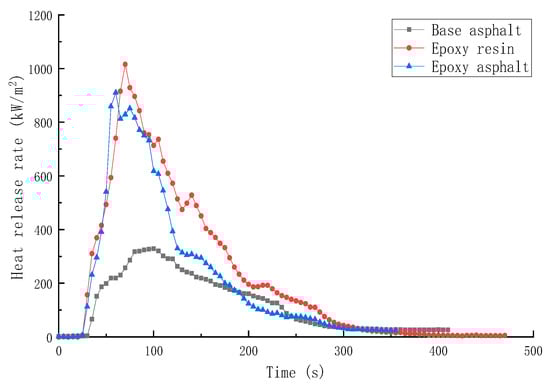 Under strong thermal radiation, all types of materials quickly burned. The HRR reached the peak rapidly after ignition, and then abruptly dropped. The insufficient combustion of the polymer generated a large amount of black smoke and had a pungent smell. Within 500 s, all materials burned. Among them, the residual carbon remaining after pyrolysis and combustion of epoxy resin burned the least, and the residual carbon rate was less than 1%, which is consistent with the test results of thermogravimetric analysis. It was speculated that most substances in the materials were decomposed into gas components. Although base asphalt and epoxy asphalt had some residual carbon after combustion, the residual carbon was relatively broken and did not form a complete carbon layer.
