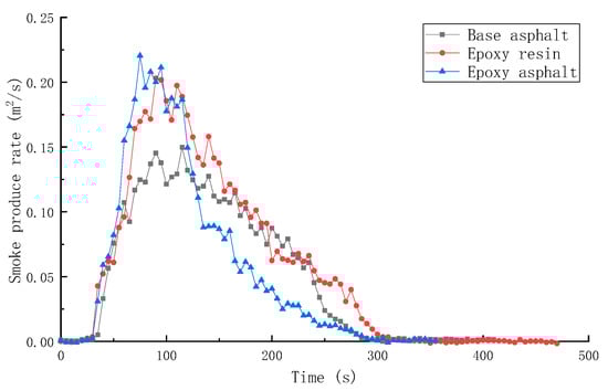 Overall, the trend of SPR was consistent with that of HRR. When the HRR reached the peak, the SPR was the highest. The SPR and TSR of epoxy resin were higher during the test, while the SPR of epoxy asphalt was higher in the early stage, and then sharply decreased. The TSR was close to that of base asphalt, which was approximately 2400 m2/m2, indicating that the introduction of base asphalt into epoxy resin in the form of an interpenetrating network reduced the smoke generation of resin to a certain extent.