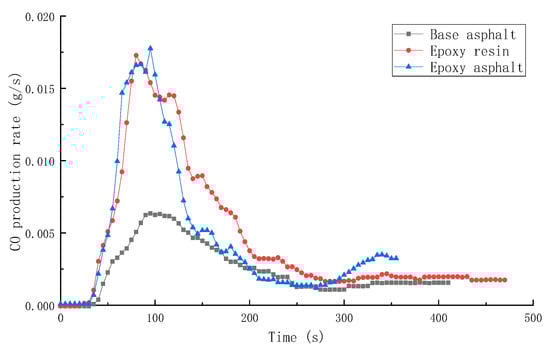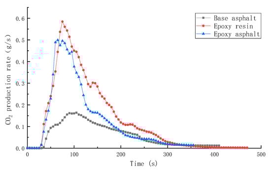 HRR and THR are important for estimating the combustion safety of polymers. Both these parameters represent the thermal feedback generated in the material combustion process. The larger the HRR and THR, the more intense the pyrolysis process; however, it also results in worsening the safety. According to the test results, the time for base asphalt, epoxy resin, and epoxy asphalt to reach the peak of HRR was 100, 70, and 60 s, respectively. It was easier for the resin materials to reach the combustion conditions, and the peak heat release rate (pkHRR) and THR of epoxy resin were the highest, reaching 1015.7 kW/m2 and 104.5 MJ/m2, respectively. The HRR curve presented sharp peaks. Although the pkHRR and THR of base asphalt were the lowest, that is, 328.8 kW/m2 and 50.5 MJ/m2, respectively, the combustion curve was relatively smooth, indicating that the epoxy resin combustion was more intense, and the base asphalt combustion was less intense.