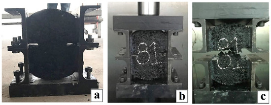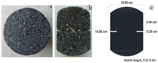 As shown by Zhou et al. [41] and considering that described by Aliha et al. [19], the geometry of the test specimens is generally circular, since asphalt samples are usually manufactured by a cylindrical Superpave Gyratory Compactor (SGC), or are extracted from the field using cylindrical coring devices. Therefore, in this work, a hot mix asphalt (HMA) was designed using a cylindrical laboratory test specimen that was 15 cm in diameter and 5 cm thick (see Figure 1a) based on the methodology of the Superpave method, as mentioned in Kennedy et al. [58].
