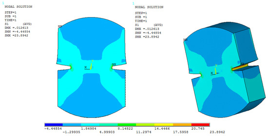 Furthermore, to compare the numerical results obtained in ANSYS with those obtained in the experimental direct tension tests, a nodal analysis was performed on the 3D model of the specimen to simulate the stresses acting inside the specimen at the time when the maximum load is applied and before the fracture occurs (see Figure 4).