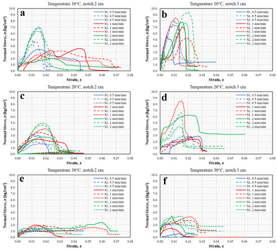 Figure 5 shows the normal stress and unitary strain states, while Figure 6 shows the shear stress and angular strain states. According to Figure 5a, which corresponds to a specimen with a 2 cm notch tested at intermediate temperature of 10 °C and different load application rates, it is evident that the elastic behavior of the asphalt material dominates (greater stiffness in the samples); although a higher stress state is obtained, failure occurs in a fragile form, with no opportunity for recoverable strains. For specimens tested at a temperature of 30 °C (see Figure 5e), in most specimens, the viscous component of the material was significantly present. It means that, at very slow rates (0.5 mm/min), the viscous component dominates, diminishing the resistance to normal stress; in addition, permanent strains were present. However, at rates of 1 mm/min, the behavior of some specimens is close to the viscoelastic one. On the other hand, for the application of the fastest rate (2 mm/min), the specimens behave in a quasi-fragile manner. This variability is influenced by temperature, rate, and type of loading [60,61]. Therefore, this condition was discarded and not considered a good representation option. The above coincides as described by Saha and Biligiri [38] since the increase in temperature can reduce the elastic properties of the binder, which becomes viscous [19], while the reduction in temperature decreases the performance of the asphalt mix [42], which makes the binder brittle and the asphalt mix vulnerable to cracking [12,19]. For specimens tested at a temperature of 20 °C (see Figure 5c) at different load application rates, it was observed that the specimens adopted both components of the asphalt material (elastic and plastic), thus presenting a quasi-fragile behavior, which was ideal for evaluating cracking, as it was consistent with the objective of representing the real conditions to which a flexible pavement is subjected. The above described showed that 20 °C is the temperature at which the direct tension test performs best; this is consistent with Kim [60], as he specifies that asphalt undergoes thermal cracking at intermediate temperatures (5 to 45 °C), in which the asphalt exhibits viscoelastic behavior.