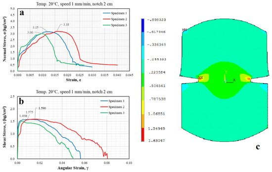 It should be noted that the shear stress results obtained from the tests and simulations follow Mohr’s interpretation, which states the maximum shear stress in the plane during the uniaxial tension test is equal to 50% of the normal stress value at the yield limit (Figure 7c). It means, from Figure 7, if a direct tension test is performed, a failure stress will be equal to the highest principal stress, which for the specimen would be the yield stress. However, since it is unconfined, the intermediate and minor principal stresses are zero. Therefore, there is only one Mohr’s circle that is tangent to the origin. Then, at failure, if the major principal stress is equal to the yield stress or rupture stress (normal stress specimen 1 = 3.15 kg/cm2), the value of the maximum shear stress that caused the failure is the radius of the circle and equal to half of the major principal stress (shear stress specimen 1 = 1.575 kg/cm2). However, according to the model, the fracture caused by the maximum shear stress appeared much earlier in a plane other than the plane considered in the analysis.