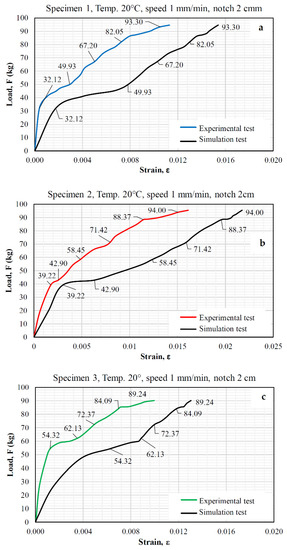 Furthermore, Figure 8 shows a comparison between the load-strain curves of the simulations and the experimental direct tension tests. Based on Figure 8, it is evident that the results of the cracking behavior of the asphalt specimens in the direct tension test and the simulation of the proposed model varied by 30% to 35%. This result was obtained using the indirect result error calculation method, which analyzes two databases with different magnitudes that are related to one another. Therefore, it was established that the direct tension test results and the simulations were relatively consistent (see Figure 8); thus, the FEM model is congruent, since the simulation environment represents the operational conditions of an asphalt pavement because the elements are considered continuous media.