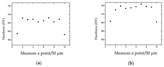 It can be seen that the microhardness of Process 1 and Process 3 is lower, and the microhardness of Process 2 and Process 4 is higher. At the same time, the microhardness of the edge area of the tungsten wire is significantly lower than in the intermediate area.