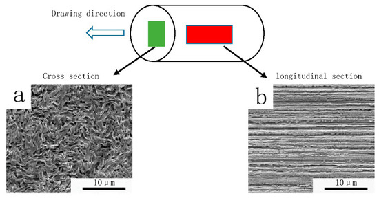 As can be seen from Figure 3, the grains of the tungsten wire in the longitudinal section are long fiber-like grains, and grains in the cross section are curled instead of equiaxed. This indicates that during the preparation of the tungsten wires, the grains are elongated along the deformation direction, and the elongated intertwined grains composed of this special microstructure are gradually formed. The same experimental results are also repeated in E.S. Meieran and A. Barna’s papers [16,17].