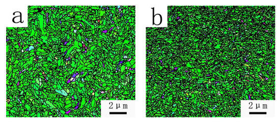 The microstructure of the wire was studied by electron backscatter diffraction and field emission scanning electron microscopy (QUANTA FEG650) (American FEI, Hillsboro, OR, USA) using an accelerating voltage of 20 kV. In order to avoid data inaccuracy in one single area, information was collected from different regions, and all information from each area showed a similar microstructure.