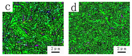 As is shown in Figure 5, when the diameter of the tungsten wire is 0.5 mm, the size of the grains has a significant change. Using different wire drawing processes, tungsten wires with different grains size were obtained. The average sizes of the grains shown in Figure 5a–d are σ = 0.1684 μm, σ = 0.0982 μm, σ = 0.1361 μm, σ = 0.1024 μm. It can be seen that the sizes of grains prepared by Process 2 and Process 4 are much finer than those by Process 1 and Process 3.