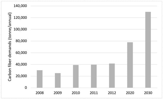 The high potential and unique characteristics possessed by carbon fibres have led to a significant increment in their market demands. The carbon fibre market is growing bigger and bigger, starting from the last decade, as the result of great utilization and application in various industrial sectors. According to a carbon fibre market report in 2019, the market is expected to expand from USD 4.7 billion to USD 13.3 billion in the ten years starting from 2019 [16]. A carbon fibre compound annual growth rate (CAGR) of 12.5% is projected between 2019 and 2029 [17]. The largest segments recorded for its carbon fibre demands are in the aerospace and defence end-use industrial sectors. This is the consequence of the growth of aircraft production by Boeing and Airbus. It is forecasted that Boeing and Airbus will request approximately 9000 newly built wide-body aircraft in the period of the next 20 years. Similarly, no decreasing trend is observed in carbon fibre usage for aircraft with a narrow body. As stated by The Teal Group, an annual growth rate of 5.8% is expected in the aircraft production market size (USD 164 billion up to USD 218 billion from 2017 to 2022) [18].