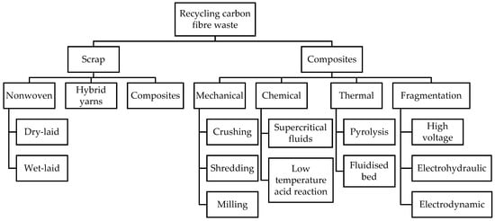 - Pakdel, E.; Kashi, S.; Varley, R.; Wang, X. Recent Progress in Recycling Carbon Fibre Reinforced Composites and Dry Carbon Fibre Wastes. Resour. Conserv. Recycl. 2021, 166, 105340. [Google Scholar] [CrossRef]