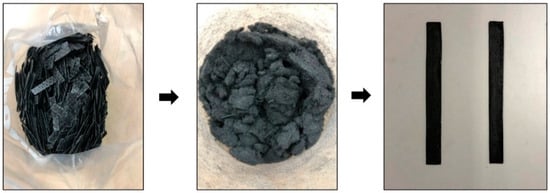 The first type of method is mechanical-based recycling processes. This process consists of breaking down the carbon fibre waste or carbon fibre-reinforced polymer composites into tiny pieces by crushing, shredding, milling or other similar breaking methods. The scrap produced is then strained and categorised into products with a high content of powdered resin (fine recyclate) and products with a high fibrous content (coarse recyclate). This process does not release poisonous or hazardous gas. The size of the final recycled products can vary in the range of 50 µm to 10 mm [26]. However, the limitation of mechanical-based recycling is that it could only be implemented as a partial reinforcement material for other composites or as a charge due to limited incorporation with base material [27]. Thus, the process is suitable for composite wastes with known origins and are relatively uncontaminated. Fine recyclate has the potential to be reused in the application of the original polymer matrix, while for coarse recyclate, the reinforcement properties are not as good as those of the virgin fibre. Hence, the degradation studies for recovered fibres are crucial because the re-manufacturing of the inconsistent and non-constructed coarse recyclate is quite difficult [28]. A continuation of this journal review topic led to a research project. The research project was carried out and funded by the same group and financial institution as this publication. Figure 3 shows recent progress in recycled carbon fibre composite study samples under this project funded by the Ministry of Education Malaysia.