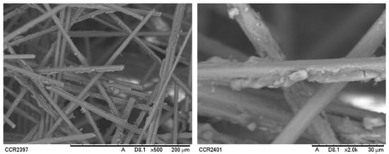 SEM images of recycled carbon fibre waste with ×500 and ×2000 magnification (pictures were originally taken at the Centre of Corrosion Research, Universiti Teknologi Pertronas).