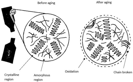 In 2009, Menail et al. studied the effect of water ageing on composites’ properties after 100, 500 and 1000 h of immersion. Both types of fibre, Kevlar and glass fibre, experienced a reduction in ultimate stress and strain as the immersion time increased. The behaviour of the material remained quasilinear before rupture occurred [83]. Phifer et al. discovered that the tensile strength and stiffness of fibre-reinforced polymer composite reduced by approximately 60% and 10%, respectively, after long immersion in fresh water lasting approximately 2 years [84]. Jiang et al. observed a reduction in the mass of fibre-reinforced polymer composites starting at an ageing condition of 40 °C. A humid ageing environment supported by elevation in temperature increased the rate of moisture diffusion and lessened the time required to obtain an initial equilibrium of moisture [85]. Lee et al. found that the increase in thermal ageing of fibre-reinforced natural rubber composite resulted in oxidation and cross-linking reactions in the rubber matrix. The oxygen content of the natural rubber matrix increased with an increase in thermal ageing time and temperature because of the oxidation that occurred on the surface as the temperature rose [86]. Figure 5 illustrates the oxidation and breaking of chains caused by the ageing process on bio-based fibre composites.