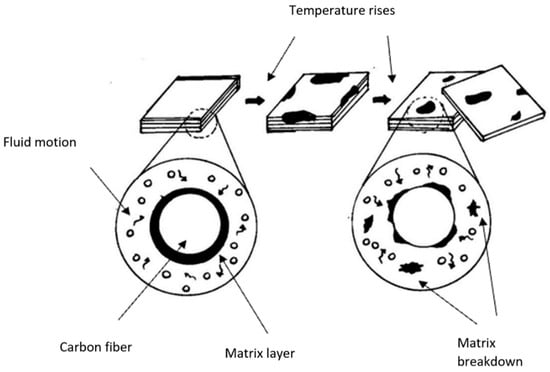 In research by Hailin et al., carbon-reinforced polymer composite specimens submerged in artificial seawater at high temperatures experienced extreme degradation, and changing the sodium chloride concentration of the seawater did not affect the tensile strength [90]. Another study was carried out by Ibrahim et al. to investigate the effect of temperature on glass fibre epoxy composite joints. Three specimens were immersed in hot water at three different temperatures for certain periods. It could be seen from the results that the specimens immersed in hot water at 50 °C absorbed 0.31 wt% moisture, and 0.71 wt% moisture was absorbed by the specimen immersed in 70 °C hot water. At 90 °C, the specimen absorbed 0.76 wt% moisture. Overall, the high absorption of moisture by the specimen was due to resin matrix damage that occurred as the temperature of the water increased. The weakening in the matrix and interfacial fibre matrix led to larger gaps, and this allowed the water to be absorbed into the composite plate. Post-immersion inspection of the specimen revealed that the higher temperature of water, the weaker the joints, hence decreasing the tensile strength [91]. Hagihara et al. in 2018 stated that nylon6-based carbon fibre-reinforced thermoplastics (mixture of epoxy resin, polyamide and polycarbonate) degraded after being exposed to high-temperature and high-pressure steam. The molecular bond strength of the material decreased, as well as its bending strength from 811 to 255 MPa. Another study was conducted in 2020 by Li et al., in which it was discovered that the tensile strength together with the residual thermal stress of E-glass fibre polymers decreased with increasing exposure temperature [66]. Figure 6 shows an illustration on how the delamination process occurred after the polymer matrix was broken down due to the rise in fluid temperature.