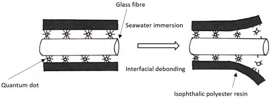 In 2016, Sun et al. immersed a carbon fibre-reinforced polymer anode strip in sodium hydroxide (NaOH) solution and pore water solution while applying a current of 0, 0.5 and 4 mA. The evident final degradation rate of the strip anode with an applied current of 4 mA was 12.4 μm/day for the NaOH solution and 13.6 μm/day for the pore water solution [100]. A few other studies, in which the degradation properties of various types of fibre composites were mainly tested after being immersed in various salt solutions, showed similar trends in the reduction in tensile strength. Wang et el. found that hybrid basalt-carbon fibre-reinforced polymer tendons experienced degradation under high stress in a salt solution [65]. Similar results obtained by researchers proved that fibre composites degraded when they were exposed to moist conditions with a high salt content [59,60,62]. Yuan et al. implemented the quantum dots analysis technique to study the degradation of a fibre-reinforced polymer composite after being immersed in seawater. After 6 months of immersion, a decrease of 2.5% in glass transition temperature, 13.8% in ultimate tensile strength and 9.8% in maximum flexural strength was observed [62]. Figure 7 shows an illustration of the quantum dots technique used to study the breakdown of interfacial bonding between the polymer resin and glass fibre in this study.