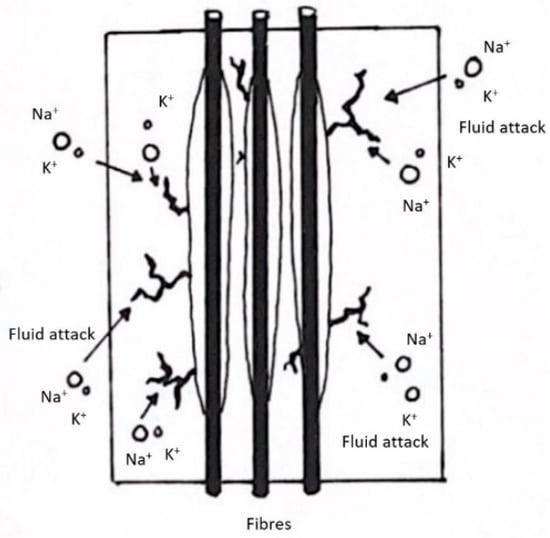 Judd stated in his research that carbon fibres are inert to chemicals such as alkaline solutions at any concentration or temperature (up to boiling point). However, they will experience degradation when they are combined with a polymer matrix [106]. The coupling agents that make up chemical bonds in carbon fibre epoxy may be ruptured due to the high concentration of hydroxyls that come into contact with them. An example of the most popular coupling agent is silane, which is commonly added to glass fibres. Elevation in temperature of the alkaline solution will further accelerate the degradation process, as stated by Benmokrane et al. [107]. Several studies have suggested the idea of combining glass fibres with carbon fibres as composites due to their potential strength enhancements. However, glass fibres are subject to damage when alkaline environments are introduced. The fibre breakdown is a combination of two processes: first, the alkaline solution attacks the glass fibre and second, the hydration products grow in between individual fibre filaments [108]. Calcium hydroxide nucleation on the surface of the fibre resulted in fibre embrittlement. The hydroxylation process forced the surface of the fibre to become rough and pitting to occur. Aggressive ions such as calcium, potassium and sodium could accelerate the degradation when combined with other types of alkali salts [109]. Figure 8 demonstrates how aggressive ions diffuse into microcracks and result in fibre breakdown.